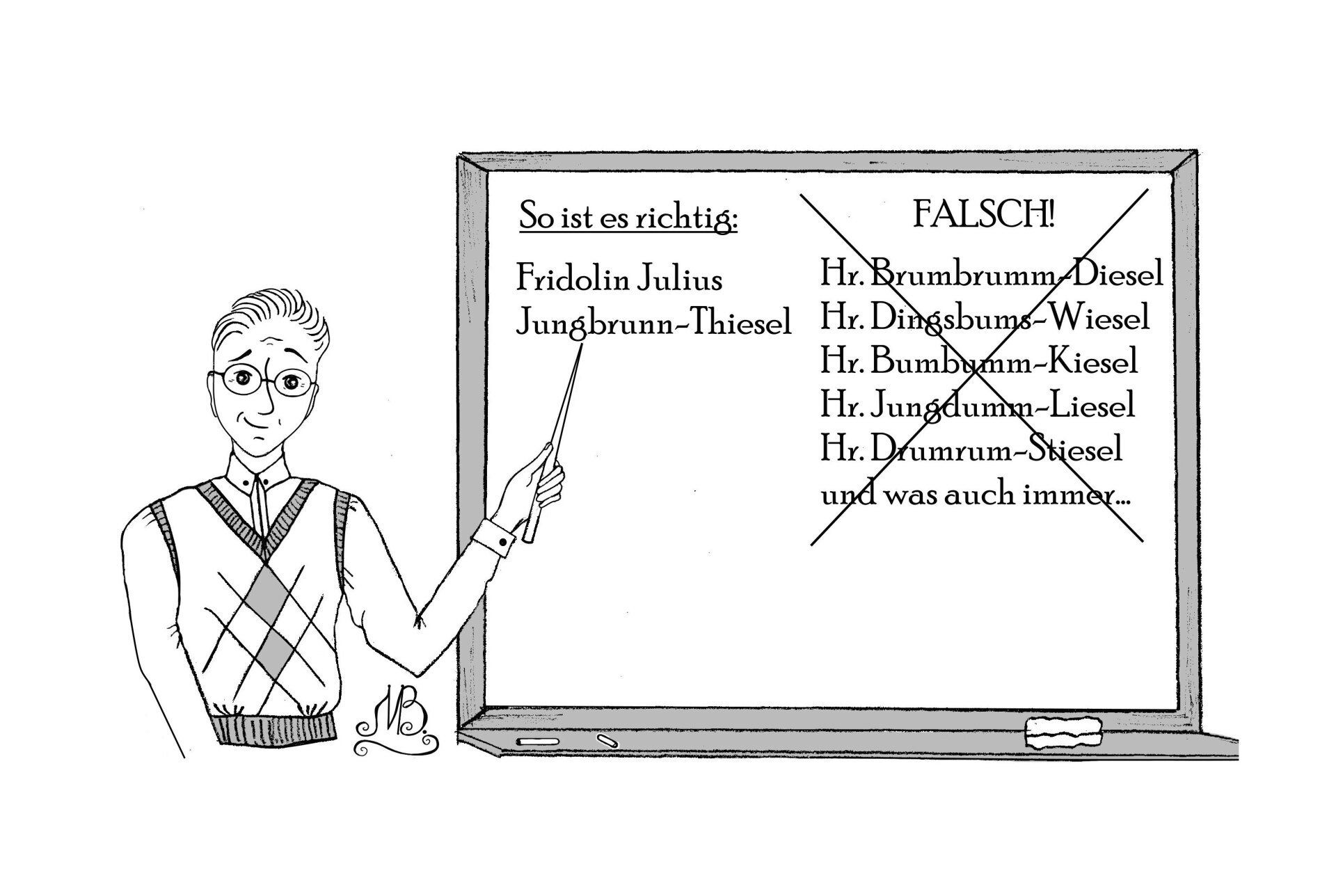 Der junge freundliche und ein bisschen linkische Klassenlehrer von Freya hat ganz schön zu kämpfen mit seinen Kindern in einer kleinen Dorfschule. Die kleinen Grundschulen auf dem Land werden oft übersehen und stiefmütterlich behandelt und so fühlen sich die Lehrer dort überfordert und eben vergessen. Das ohnehin nicht leichte Leben von Herrn Jungbrunn-Thiesel wird von seinem Namen zusätzlich erschwert - nur wenige Kinder schaffen es, den Namen richtig auszusprechen. Sogar ihre Eltern verzweifeln mitunter daran. Als Freya eingeschult wurde, meinte ihr Vater ernsthaft, die Kinder können automatisch in die zweite Klasse versetzt werden, sobald es ihnen gelingt, sich den Namen „Jungbrunn-Thiesel“ zu merken.